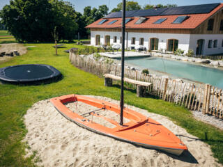 Unser altes Segelboot ist viele Seemeilen auf dem Chiemsee gesegelt, bevor es hier gestrandet ist. Als Sandkasten bietet es zusammen mit Trampolin und Schaukel viel Spaß für die Kleinen.